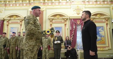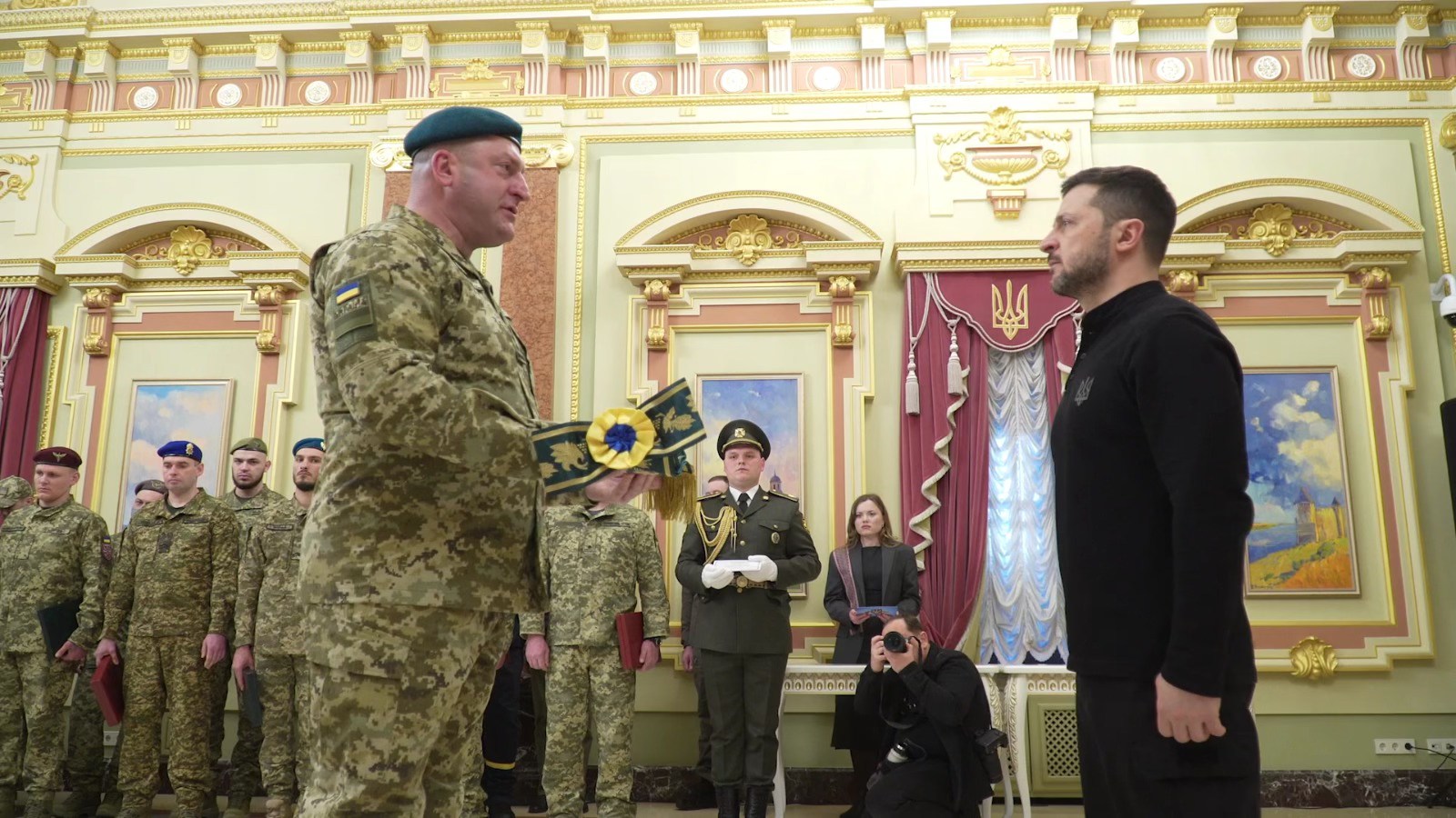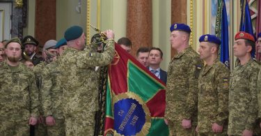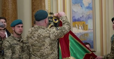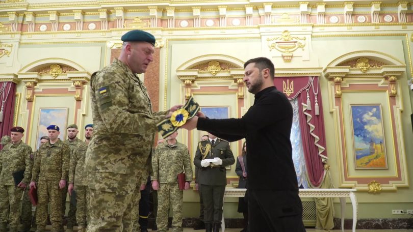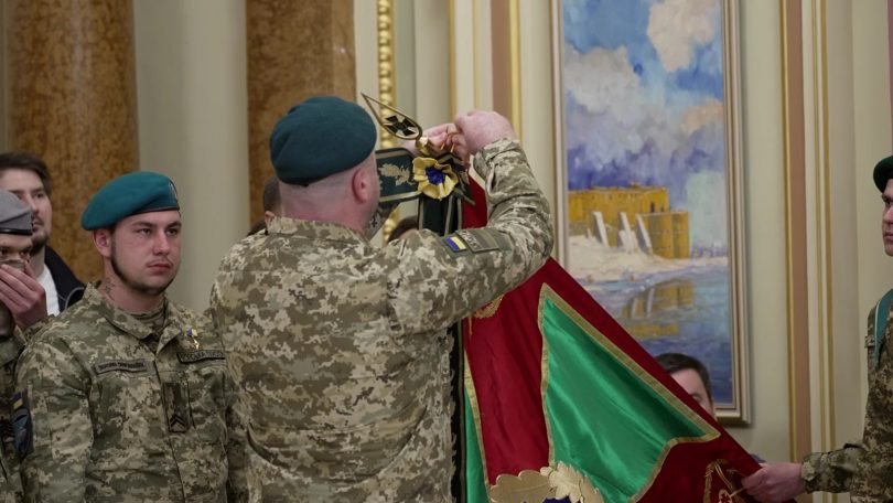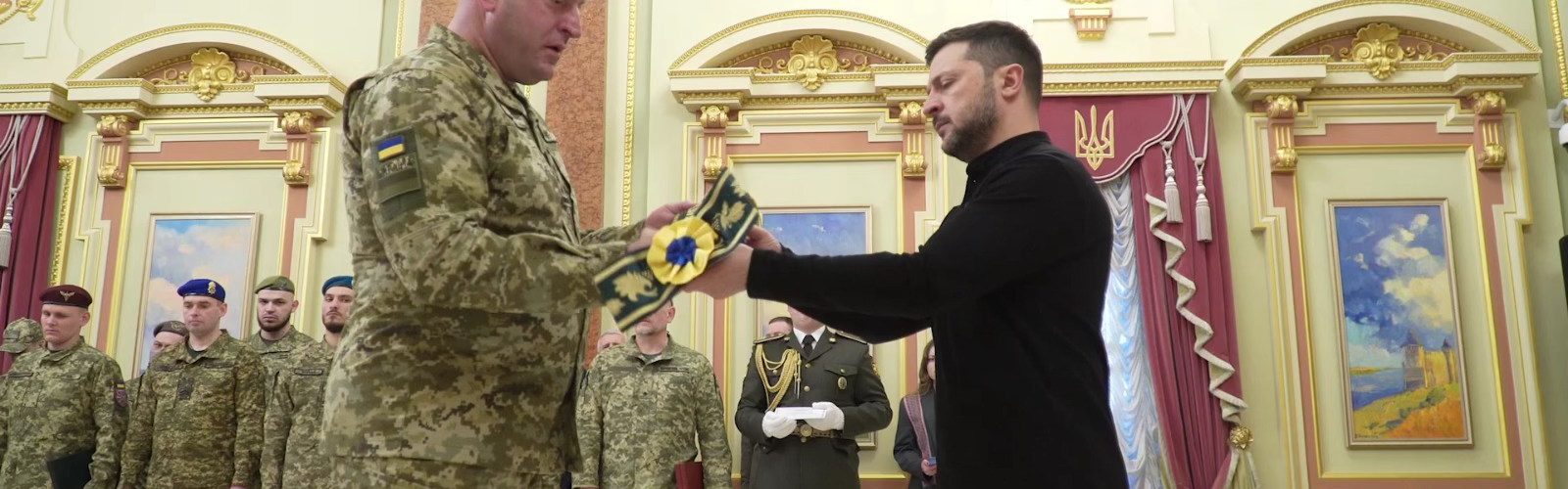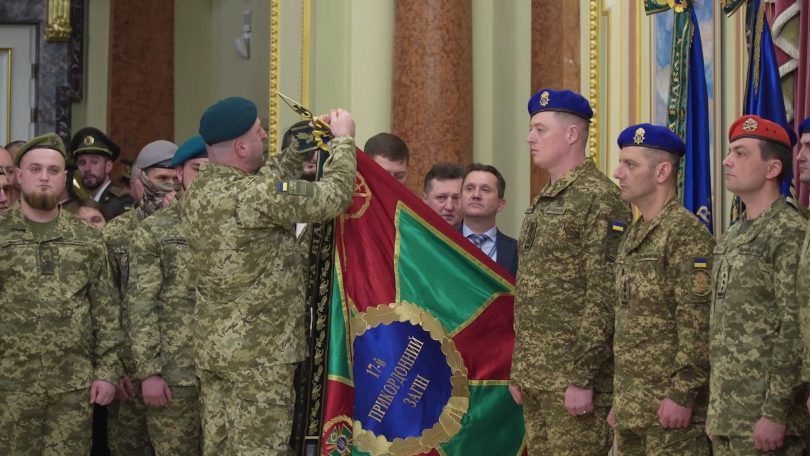 Стрічку до Бойового Прапора військової частини «За мужність та відвагу» Володимир Зеленський вручив вчора, на передодні третьої річниці повномасштабного російського вторгнення, начальнику прикордонного загону полковнику Павлу Цвеліху.