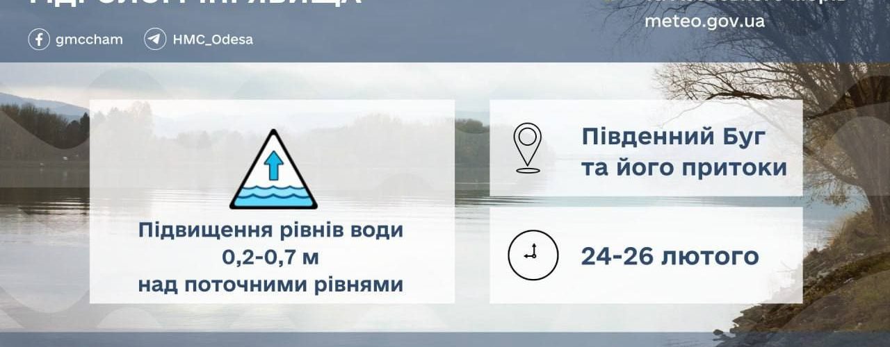 Упродовж 24–26 лютого на території Одеської області прогнозується підвищення рівня води в річках басейну Південного Бугу та їхніх притоках. За попередніми оцінками, вода може піднятися на 0,2–0,7 метра.
