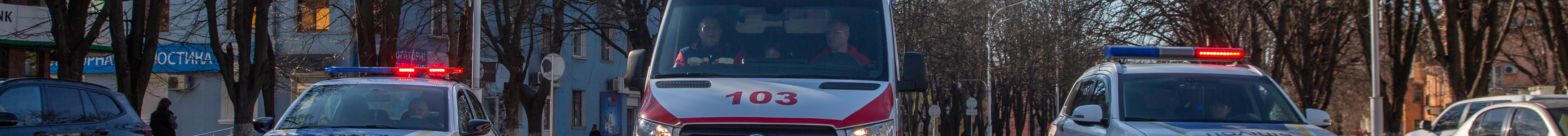 Карета швидкої медичної допомоги у супроводі автомобілів патрульної поліції з увімкненими проблисковими маячками та сиреною проїхалася містом, закликаючи водіїв надати перевагу у русі та поступитися дорогою.