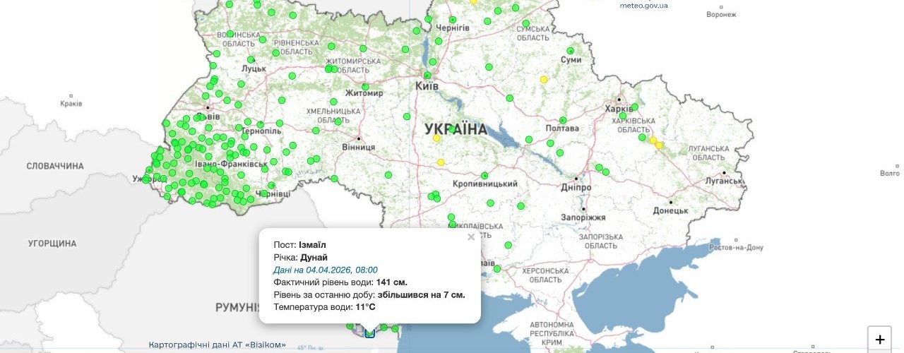 Станом на 08:00 4 квітня 2026 року на гідропості в Ізмаїлі рівень води зафіксовано на позначці 141 см. За останню добу він підвищився на 7 см.